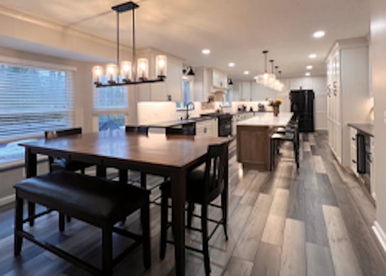 Kitchen: Painting perimeter cabinets white or light gray and using a stain or other accent color on the island “gives you a really dynamic look in the kitchen,” Pauley says.