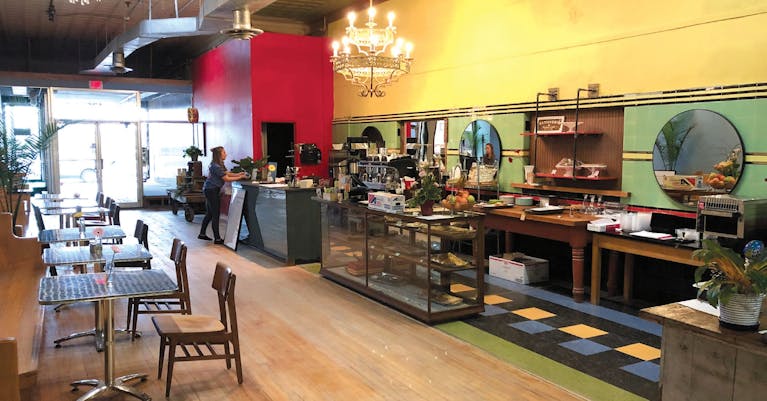 GENEROUS WOODEN antique tables are populated with guests who savor delicate pastries and lap up every last bit of Union Town Provisions’ homemade vinaigrette dressings from the cafe’s hearty salads. An eclectic collection of chandeliers hangs as functional eye candy throughout the historic storefront. The original hardwood floors were restored, and owners Shawn Grieves and Timothy Scholl unearthed a piano during the renovation, which turned into a bit of a treasure hunt as they discovered features like a tin ceiling hidden beneath a drop ceiling and 1930s tiles tucked behind walls.