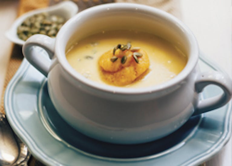 6. Place 3 scoops of winter squash in the middle of a bowl, arrange spaetzles around the edge of the bowl and ladle the winter squash soup into the bowl. Sprinkle with toasted pepitas.